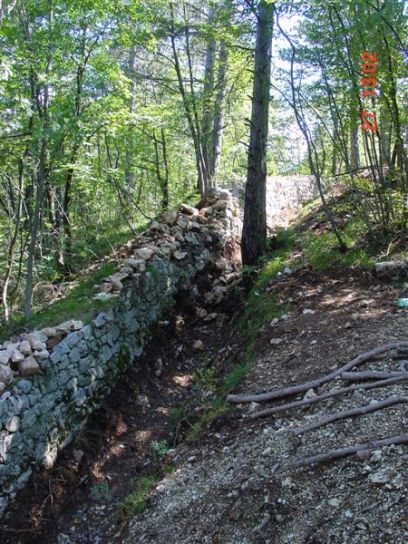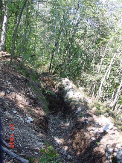 Volksfest auch auf dem Monte Calisio! Der Ortsteil Villamontagna feierte. Natürlich wurden die Arbeiten der Freiwilligen und der Ortsgruppe der Alpini besichtigt. Dabei handelt es sich um die Freilegung eines Teiles der Hauptverteidigungslinie der Festung Trient im Bereich Campel. Der Minibagger hat seine Arbeit beendet, fast 200m des Schützengraben wurden freigelegt, jetzt werden die Trockenmauern instand gesetzt. Die Arbeiten werden noch in diesem Jahr beendet. Danach wird der Wanderweg durch den Graben geleitet. Hinweistafeln werden die geschichtlichen Ereignisse in 3 Sprachen (deutsch, englisch, italienisch) erklären und beschreiben. Eine Abzweigung wird in eine MG Stellung mit der nahe liegenden Kasematte führen. Auch hier wurden bei der eingestürzten Kasematte Betonteile mit dem Abdruck "Donawitz" gefunden. Gruss VJ