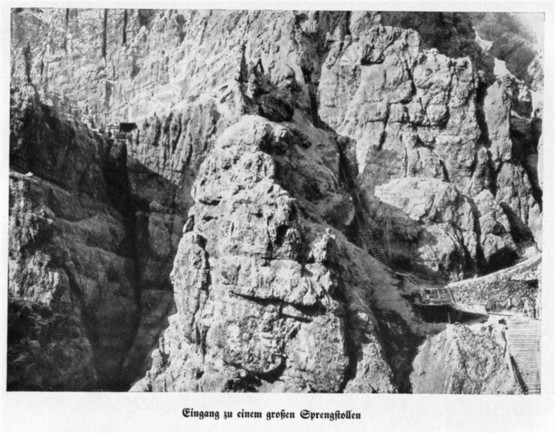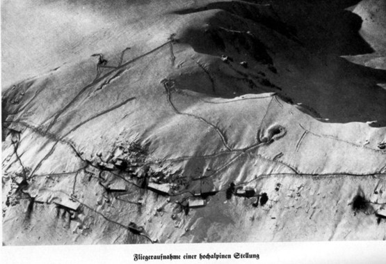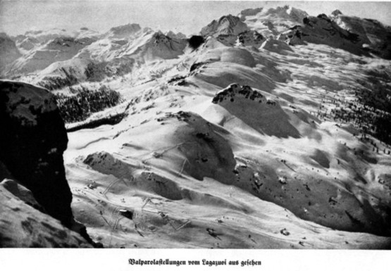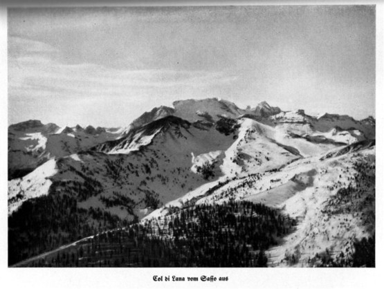 Blick über den Valparolapaß zum Settsass und Col di Lana. Standpunkt der Aufnahme ist oberhalb vom Valparola Lager (Lag da wo heute der Kriegerfriedhof Valparola ist)