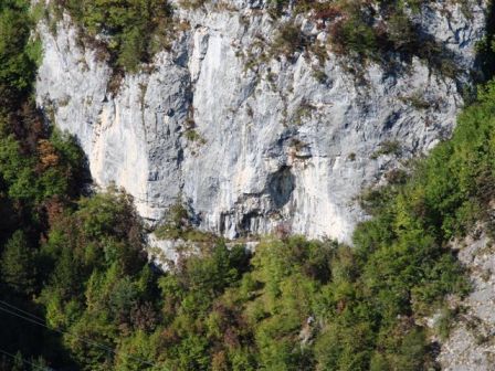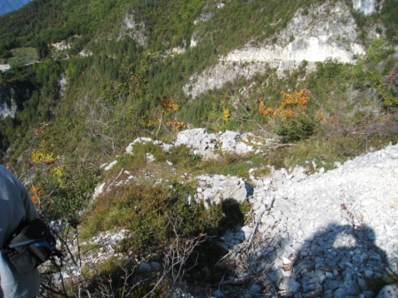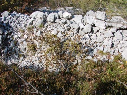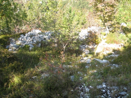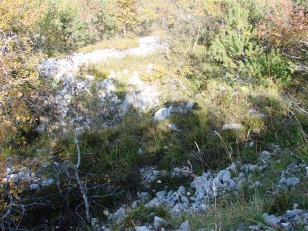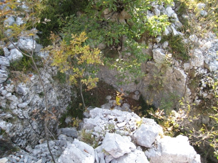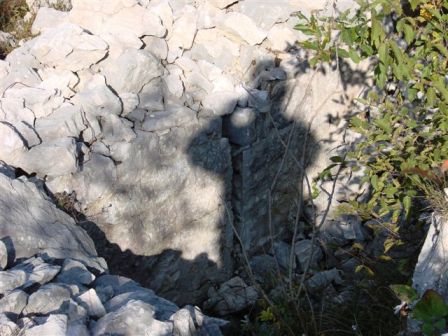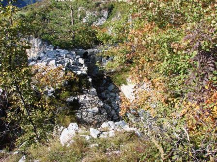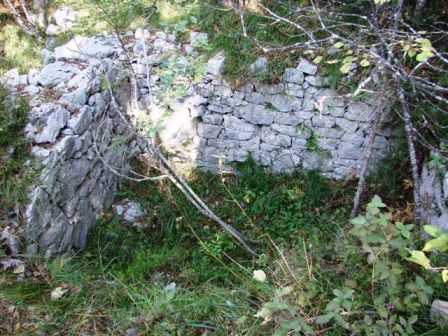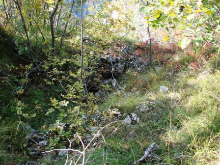 Dopo la batteria in caverna, alla sua uscita si imbatte subito nelle linee di difesa intorna al forte. Nach dem Ausgang der Kavernenbatterie beginnen sofort die umfangreichen Verteidigungsstellungen an der Flanke des Werkes. VJ