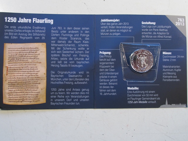 Nicht nur Pasing wird heuer 1250 Jahre alt, sondern auch das Dorf Flaurling in Tirol. Beide Orte stehen auf einer gemeinsamen Stiftungsurkunde. Pasing/Flaurling - Pasing ist älter als die Stadt München, die es seit 855 Jahren gibt. Auch das Dorf Flaurling in Tirol, das an der alten Salzstraße liegt, feiert heuer sein 1250-jähriges Bestehen. Beide Orte stehen auf einer gemeinsamen Stiftungsurkunde: Hier. In Pasing kann man ein 1250-Jahre-Bier und einen Bierkrug erwerben, und es finden viele Feiern während des Jahres statt. In Flaurling (Tirol) gibt es während des ganzen Jahres ebenfalls viele Festlichkeiten - und es wurde eine extra Jubiläumsmedaille geprägt.