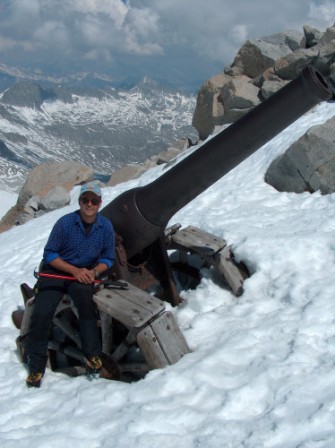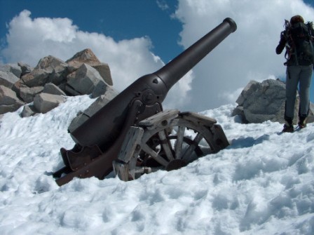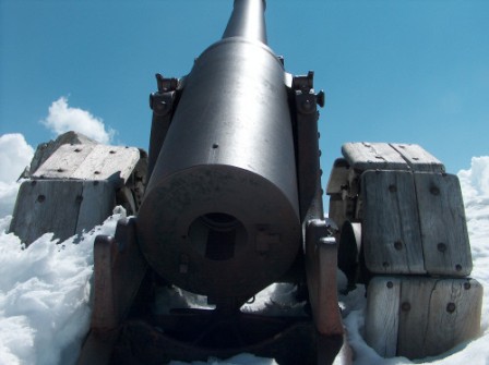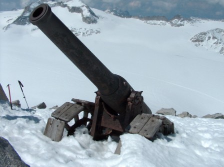 Als im Herbst 1917 nach der 12. Isonzoschlacht die italienische Front zusammenbrach mussten viele schwere Geschütze zurückgelassen werden, auch große Mengen an Granaten fielen in die Hände der Österreicher. Die drei 149er wurden mit der Bahn vom Isonzo bis Goldrain im Vinschgau gebracht. Im Frühjahr 1918 wurden die Geschütze mit Zugmaschinen bis nach Zufritt im hintersten Martelltal gezogen. Dort wurden sie zerlegt und per Schlitten über Zufall und den Zufall- und Fürkeleferner bis zum inneren Kofel mit Menschenkraft hochgezogen. Es sollen 120 Mann die 3,3 Tonnen schweren Rohre hochgezogen haben, danach folgten Lafetten und ein Montage Kran. Die Granaten und Kleinteile wurden mit der Seilbahn auf den Eisseepass gebracht. Die Geschütztransporte überwanden über 1000 Höhenmeter von Zufritt auf den inneren Kofel! Ab Juni 1918 dürfen alle 3 Geschütze in Stellung gewesen sein, das Hauptziel waren die Nachschublinien der Italiener im Val Cedec. Da die Geschütze aus stark überhöhter Positionen feuerten konnten maximale Schussweiten von über 10km erreicht werden, die Feuerleitung erfolgte von der Königspitze und dem Cevedale aus. Die Mannschaften der Geschütze feuerten indirekt, d. h. sie konnten das Ziel nicht sehen, aber dafür konnte sie der Feind auch nicht sehen und bekämpfen. Bei Kriegsende wurden die Geschütze stehen gelassen, nur die Verschlüsse wurden abmontiert und in eine Gletscherspalte geworfen, so waren die Geschütze unbrauchbar und auch das italiensche Heer hatte kein Interesse die Geschütze zu bergen. Während der Stahlkrise in den 30er Jahren wurden die Lafetten der Geschütze teilweise von Hand zersägt und in kleinen Teilen zu Tal gebracht, die mühsame Arbeit scheint nicht lange angedauert haben, so ist die Lafette der untersten Kantone fast noch vollständig erhalten.