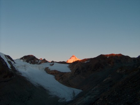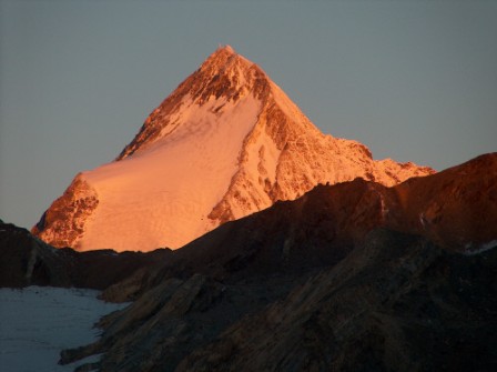 Alpenglühen auf der Königspitze kündigt einen schönen Tag an.