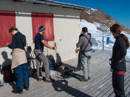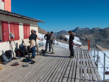 Auf der Terrasse der Casatihütte, die Mannschaft bereitet sich vor, der Kampf mit