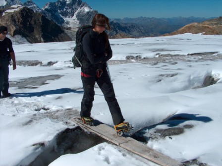 Barbara quer die fiese Spalte, als erfahrene Gletscherläuferin zollt sie auch dieser Spalte keinen Respekt.