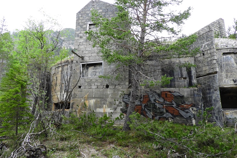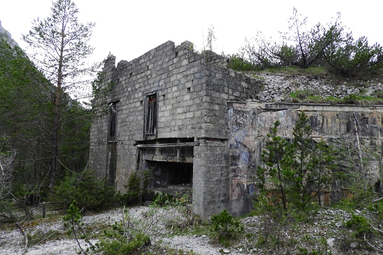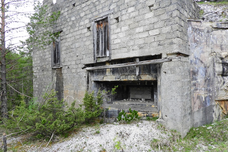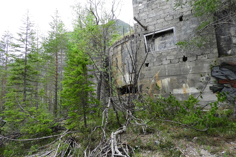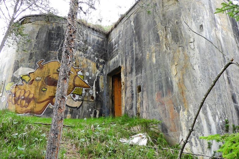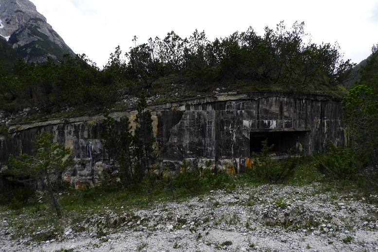 Das Werk nr. 2 liegt gleich hinter dem Panzergraben frei im Buschwerk der Geröllmoräne, etwas oberhalb der Strasse. Das