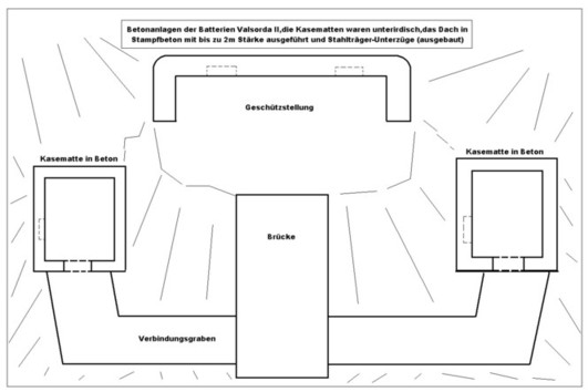 bisher nicht ermittelt werden konnten. Jede Stellung besaß 2 seitlich und unterhalb gelegene Betonkasematten für die Munition, die in Stampfbeton mit Stahlträgerverstärkung als Unterzüge errichtet wurden. Die Überdeckung ist bis zu 2m Stärke. Zu den Stellungen führt