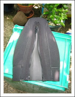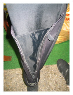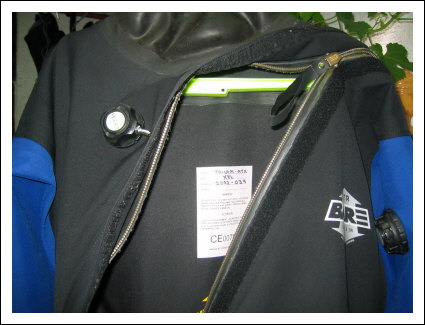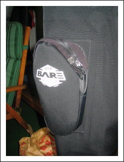 Der ATR HD hat eine gute Passform und setzt Standards in Funktionalität und Komfort. Der mit einem Front-RV versehene ATR HD wird im Oberkörperbereich aus weichem Polyester-Trilaminat und im unteren Bereich aus wiederstandsfähigem Cordura-Trilaminat gefertigt. Das Brusteinlassventil ist 360 Grad drehbar und spricht sofort an. Wegen des etwas klobigen Innenteils des Ventils drückt es auf die Rippen. Das Auslassventil am linken Oberarm ist verstellbar. Die Licht- und Radarreflektionsflächen sind auch im trüben Wasser gut sichtbar. Weiche Latexmanschetten, komfortabel beim Anziehen, sind doch fest genug um einen Wassereintritt zu verhindern. Das Gaiter-System (Unterschenkelvolumenreduktion) sorgt dafür, dass so wenig Luft wie möglich in den Unterschenkelbereich eindringen kann. Dies reduziert das Risiko eines unkontrollierten Beinauftriebs. Die Oberschenkeltasche mit Reißverschluss kann einige, kleine und nützliche Dinge aufnehmen. Besonders gelungen finde ich die Kevlar Kniepads, versprechen sie doch absolute Haltbarkeit. Ausserdem ist die separate Kopfhaube aus 7mm Neopren mit einer feinen Gesichtsmanschette hervorzuheben, die genügend Wärmedämmung aufweist. Durch den Reißverschluss ist ein leichtes Anziehen möglich und eine gute Passform gewährleistet. Wet & Dry behautet, dass der ATR HD „Der Beste“ unter den BARE Trockis ist. Der Trage- und Passformkomfort wird durch das patentierte A.T.R. System, (Automatic Torso Recoil) automatische Längenanpassung, garantiert. Das Anziehen ist problemlos alleine möglich. Nur beim Ausziehen ist ein Helfer nützlich, um den Anzug leicht über die Schultern zu bekommen. Sicherlich hat man nach einigen Tauchgängen Routine und kann sich mit Schlangenbewegungen alleine herausschälen. Optional kann er mit einem THS-Trockenhandschuh-System und mit BARE-Soft-Boots (Soft-Boots zusätzlich mit Trek-Boots) ausgestattet werden. Ein gut durchdachter und sauber