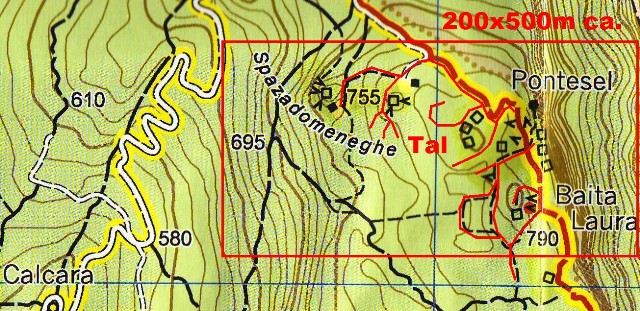 Sta mattina alle 6.00 ero sul Sorasass per disegnare le parti della grande base d´artiglieria sul Sorasass-Nord. Conclusioni: Tutto il territorio cominciando dalla Baita Laura verso Pontesel e poi girando verso ovest in direzione Spazzadomeneghe era una unica base militare. Si contano 20 piazze in barbetta o in caverna per cannoni o mortai. Due batterie fianccheggianti in casematta per mitragliatrici e 4 (!!!) osservatori in calcestruzzo per il tiro delle batterie. Trovato anche una nuova batteria per due mortai su "Schleiflafetten". Sopra Spazzadomenghe il trinceramento della fanteria e ancora ben visibile, si trovano resti di muri, postazioni per mitragliatrici (una e conservata in uno stato perfetto). La viabilita´era costruita perfettamente, numerose sentieri e piccole strade d´armi sono prensenti. Ho fatto 11 disegni particolari che devo mettere assieme per fare un unico disegno della situazione della base nello stato attuale. Sono convinto che c´e rimasto di piu, ma la pulizia della vegetazione in una parte fa gia vedere postazioni enormi con una notevole potenza di fuoco ammassato in un rettangolo totografico di 200m x 500m circa. Heute morgen um 6.00 war ich auf dem Soprasasso um die große Basis im Bereich Pontesel (Soprasasso-Nord) aufzunehmen.Ergebnis: Der gesamte Bereich von der Baita Laura über Pontesel bis hin zum Bereich Spazzadomeneghe war eine einzige gut ausgebaute Militärbasis.Insgesamt lassen sich 20 Geschützstellungen (Feldstellungen oder Kavernenstellungen) in einem teilweise sehr guten Erhaltungsstadium erkennen. Hinzu kommen 4 (!!!!) Befehlsstellen in Beton der Artillerie Feuerleitung. Beim "Kommando" oberhalb der Kavernenbatterie Spazzadomenghe habe ich zudem eine Mörserbatterie auf "Schleiflafetten" mit unterirdischer Feuerleitstelle gefunden. Durch die teilweise Befreiung des Waldes vom Unterholz findet man jetzt laufend Geschützstellungen,Munitionskasematten in Beton, Unterstände, Teile von Schützengräben, MG-Stellungen (eine ist perfekt erhalten!). Ich habe auch neue befestigte Infanteriestellungen oberhalb Spazzadomenghe gefunden, sowie Teile von Batteriewegen und Pfaden zu den Stellungen. Der gesamte Bereich hat topografisch gesehen eine Ausdehnung von ca. 200m x 500m, die Massierung von Geschützen war hier wirklich groß. Aus den 11 Teilzeichnungen werde ich jetzt eine ungefähre Gesamtskizze erstellen vom Soprasasso-Nord. Saluti, VJ