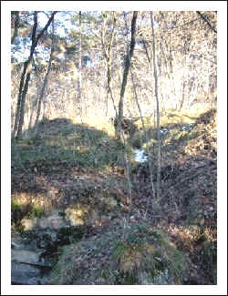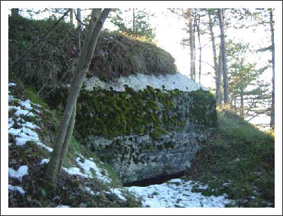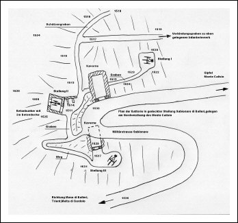 MONTE CALISIO Batterie Ulrich Mößlang der Taucherbrillenspezialist Uli Mößlang/Volker Jeschkeit Die Batterie liegt am Nordwesthang des Monte Calisio oberhalb des Maso di Bolleri und ist direkt an der Militärstrasse Sabionare gelegen.3 Artilleriestellungen sind noch gut zu erkennen, der Bunker ,in dem eine Kanone stand, hat eine gut 2 m dicke Betondecke. Überall sind wie üblich auf dem Monte Calisio Schützengrabensysteme im Umfeld, Zugangs- und Verbindungsgräben, sowie Kavernen für die Besatzungen und Munition. Sie bildete zusammen mit dem Artilleriewerk in Kavernen Melta di Gardolo die Verteidigungslinie auf der Nordwestseite des Monte Calisio und wurde durch die Militärstrasse Sabionare versorgt.