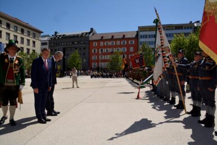 Am 06 07 2017 wurde Bundespräsident Dr. Alexander Van der Bellen bei seinem Amtsantritt in Tirol vom Land im Rahmen eines Landesüblichen Empfanges begrüßt. Der Kaiserschützenbund Tirol 1921 nahm mit einer Fahnenabordnung und dem Bundesobmann teil. Mit Tiroler Kaiserschützengruß, Hans-Peter Gärtner Vzlt i. R. Bundes .Major