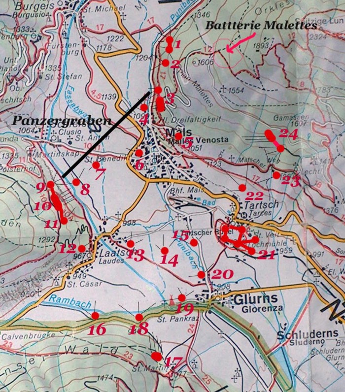 Auf der Karte sind alle Bunker der Gruppe, die Batteriebunker sind leicht länglich eingezeichnet, die schwarzen Striche geben die Schussrichtung an. Der Antipanzergraben ist schwarz eingezeichnet. Die Batteristellung Malettes ist eine offene Feldstellung auf dem Berghang gut 400mt über den Bunkern. Die Nr. 6 gleich beim Ortseingang von Mals wurde abgebrochen, es ist aber der Bauplatz noch gut sichtbar. Die gr. Anlagen sind alle in die Berghänge eingebaut und fast Unsichtbar. Gruss Wendl |