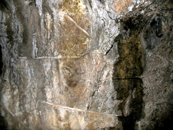 Die Bohrlöcher mit denen der Stollen ausgesprengt wurde sind noch oft in