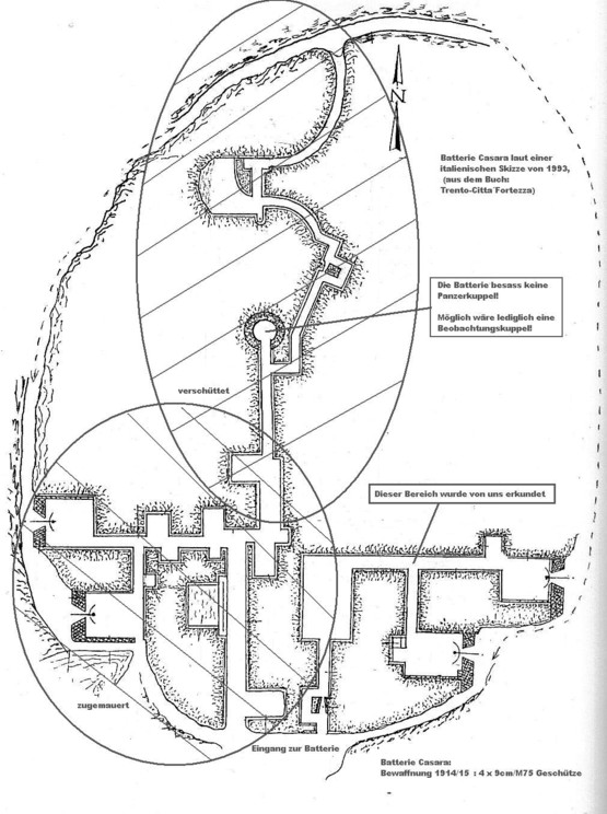 Die Batterie Casara wurde unter dem alten Werk an gleicher Stelle im Jahre 1915 als Kasemattbatterie angelegt. Ihre Bewaffnung bestand aus 4 x 9cm/M75 Geschützen. Das alte oberirdische Werk wurde zusammen mit dem Hauptwerk Civezzano im gleichen Jahr von der KuK gesprengt. Sie waren nicht beschusssicher und strategisch gesehen völlig überholt. Es ist anzunehmen, das auch die Batterie Casara nach Fertigstellung der unterirdischen Befestigungen des Monte Calisio entwaffnet wurde und sie lediglich als Lager /Unterkunft für die Infanterie diente, die die Intervallstellungen am nördlichen Abhang des Monte Calisio zu verteidigen hatten. Die Aufgabe der Frontbatterie konnte von den Stellungen bei Civezzano wesentlich besser erfüllt werden , auch die Batteriestellungen bei Campel auf dem Rücken des Monte Calisio hatten eine bessere Position. Die Kehlbatterie wurde durch die weiter vorgelagerten Batterien im Bereich Sabbionare dei Bolleri abgelöst. Deren Schussfeld und Sicht waren wesentlich besser. Die Position der Batterie Casara war strategisch gesehen völlig obsolet und der Schussbereich bzw. die Wirkung der Geschütze zu begrenzt. Es ist daher davon auszugehen, das es eine Interimslösung war, da die Befestigung des Monte Calisio und seiner umliegenden Bereiche erst am Ende das Jahres 1915 abgeschlossen werden konnte. Die beigefügte Skizze der (heute zum größten Teil) verschütteten Anlage aus dem italienischen Buch " Trento-Citta´Fortezza" verweist auf eine Panzerhaubitze der Batterie. Das stimmt nicht, die Batterie besaß keine. Es ist lediglich denkbar , das eine Beobachtungskuppel eingebaut wurde, die aus der Desarmierung der alten Werke stammte, aber auch das ist nicht gesichert. Heute ist lediglich die Frontbatterie zugänglich. Wie üblich, wurde auch hier durch Sprengungen der Eisensammler die Stahlträger und zum großen Teil auch das Zinkblech der Isolierung ausgebaut. Die Batterie ist deswegen nur schwer begehbar, außerdem droht Einsturzgefahr. Man sollte daher von einer Besichtigung absehen VJ