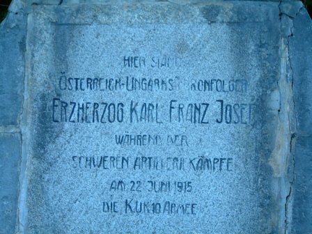 kennt! Man fährt von österr. Kommend durch Tarvis durch an Camporosso vorbei (links biegt man nach Valbruna ab), dann kommt eine Unterführung (oberhalb führt die Autobahn Richtung Udine), Sie fahren dann noch ca. 200 Meter, nach dem Bergrücken kommt dann rechter Hand eine kleine Einfahrt zu einer Betonmischanlage, hier biegen Sie in diese Mischanlage ab. Dort steht ein kleines Holzhäuschen gleich Rechts am Waldrand, und direkt dahinter keine 10 Meter steht dieses Denkmal. Gleich davor im Umkreis davon finden sich Eingänge zu Bunkern aus dem 2.Weltkrieg (wie der ganze Berg dort von Bunkern und Kavernen nur so durchzogen ist -einfach genau schaun)