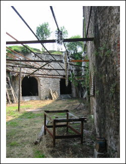 Die Stangen im Hof sind noch von einer Pilzzucht.