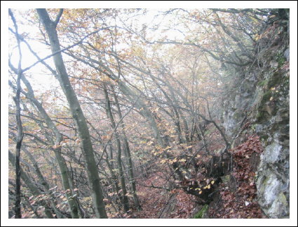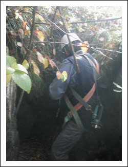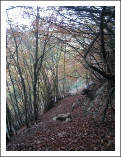 Unser Weg führt am steilen unwegsamen rutschigen Hang entlang, um an
