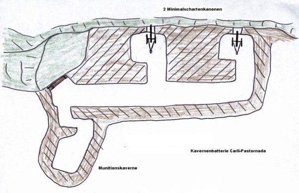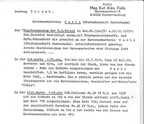 Die Kavernenbatterie Carli befindet sich am Kilometer 14 nach dem Ortsausgang von Aldeno in der Lokalität Carli, sie ist von der Provinzstraße "Destra Adige" 20m entfernt und gut getarnt. Es handelt sich um 2 Geschützstellungen für Minimalschartenkanonen und einem zentralen Munitionslager. Die Batterie wurde komplett durch den Eingang vorgetrieben, die Schartentarnung ist reiner verbliebener Naturstein des Berghanges. Durch den hohen Staubanteil beim Bohren aus einem zentralen Verbindungsgang heraus, war es notwendig "Sauerstoff zu zuführen". Die Arbeiter wären sonst bei dem hohen Staubanteil während der Arbeiten schlichtweg erstickt. Zur Spätzeit der Neubewaffnung der FS Trient gehörend (Dezember 1915) wurde sie auch noch bewaffnet, in der Liste der Sicherungsarmierung sind 2 Stück 8cm/M75 Geschütze vorgesehen. Gruss, VJ