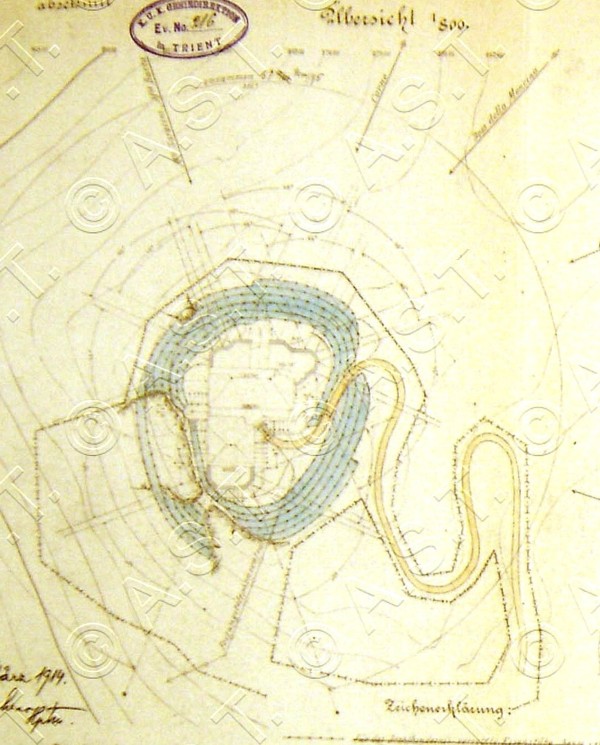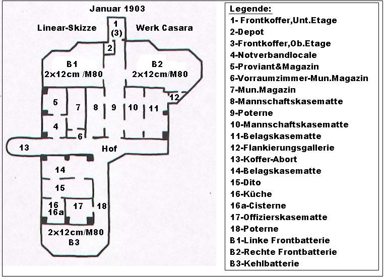 Vor der Umrüstung der KuK Feldartillerie im Jahre 1909 war das alte Werk mit 6 Stück 12cm/M61 Kanonen in offenen Stellungen bewaffnet. (siehe unsere Zeichnungen zum Werk). Die Fotos zeigen diese Kanone im Einsatz, sie stammen aus der Artilleriereserve der Festung Trient. Wo diese in Position waren, ist leider nicht mehr feststellbar. VJ