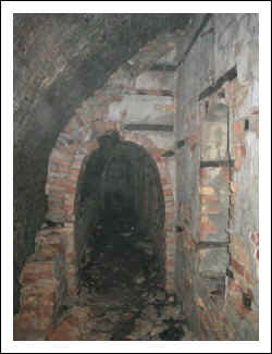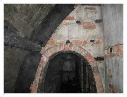 Die stützenden Holzbalken der linken tonnenförmig gemauerten Wand sind