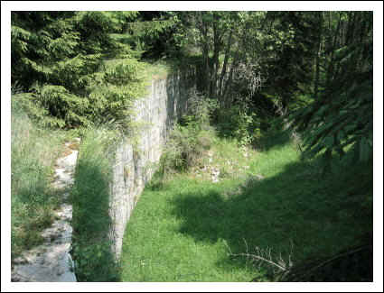 Der Kampfgraben oder Kontereskarpe, nach rechts Anstieg zum Fort.
