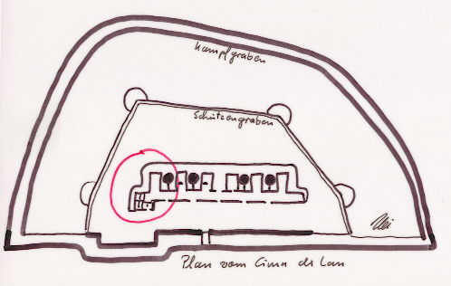 400 Metern geht man an der Betonkuppel vorbei zum Fort. Gleich nach dem