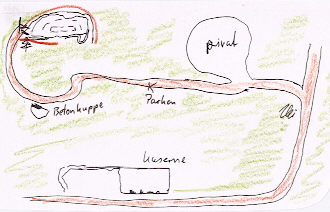 muss man links abbiegen und kann dann an der Wiese parken. Die letzten