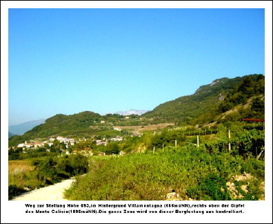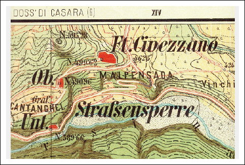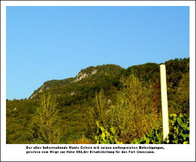 Civezzano aus deutlich erkennbar. Sie wird heute Castel Vedro genannt und ist von Villamontagna aus über den Weg 403b innerhalb 20 min. bequem ereichbar. Die Stellungen und Kavernen sind leicht zugänglich (Taschenlampe nicht vergessen). Die Kavernenstellungen im Berg bestehen aus einem Haupstollen, der in einer Stellung mit Gewehrschiess-Scharten Richtung Civezzano endet, sowie einen rechts abbiegenden leicht abfallenden Stollen ,der in einer Geschützkaverne endet (Schussrichtung Valsugana), sowie einen links abbiegenden tief in den Berg abfallenden Stollen, der allerdings nach ca. 50 m zugemauert ist. Der Haupteingang ist betoniert, der Stollenboden teilweise betoniert, die Öffnungen der Gewehrschiess-Scharten aus Stahlbeton, die Öffnung der Geschützkaverne innenseitig mit Beton verstärkt. Es handelt sich damit anscheinend um die Ersatzanlage des alten von den Österreichern vor Beginn des Konfliktes mit Italien gesprengten Fort Civezzano, welches unterhalb diese Stellung lag. Dieses war strukturell veraltet ,da bereits vor 1900 erbaut, und konnte somit dem Beschuss der damaligen modernen Artillerie in keinster Weise mehr Widerstand leisten. Deutlich zu sehende Spuren von Infanterieanlagen (Schützengräben, Postenstellungen, Betonierter Flankenbunker unterhalb der Höhenkuppe) lassen auch heute noch erkennen, daß diese Höhenkuppe schwer befestigt war. Ihre Lage ist strategisch sehr gut gewählt. Von dieser Stellung aus konnte der Zugang aus dem Valsugana-Tal kontrolliert werden, ebenso der Bereich Civezzano mit der alten Strasse Richtung Fort Casara/Monte Calisio (heutige Wege 421,403). Ausserdem konnte sie der unterhalb gelegenen Oberen