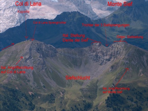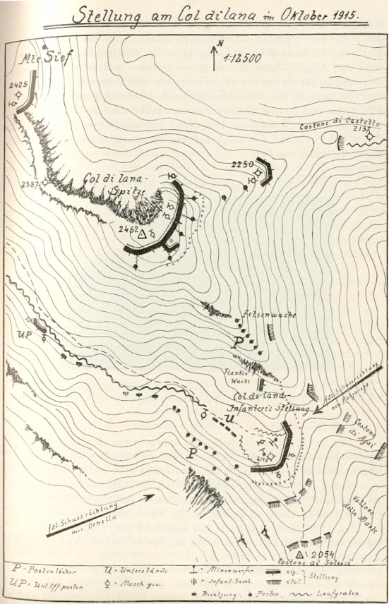 Col di Lana Seit die Kompagnie am Col di Lana Gipfel die Bohrarbeiten der Italiener bemerkt und ihnen am 5. April durch Gegensprenung einen Stollen zerstört hatte, standen Tag für Tag sowohl Spitzen- als auch Hangstellung unter schwerster Arilleriewirkung, die manchmal die Heftigkeit eines Trommelfeueres erreichte. Jede Nacht wurde mit dem Aufgebote aller Mannschaft und der verfügbaren Sappeure die Stellungen wieder ausgebessert, Hinderniselemente gelegt und die Telephonleitungen geflickt, mit fieberhafter Arbeit. In der Spitzenstellung trieb man fünf Minenbrunnen in die Tiefe, von denen zwei wieder aufgelassen werden mussten, da sie auf Massengräbern stießen, und die Sappeure vor Verwesungsdünsten nicht mehr weiterbohren konnten. Dabei stellte der sofort einsetzende Horchdienst fest, das die Welschen bereits unter den eigenen Gräben war. Durch 21er Volltreffer wurden mehrere der Baracken am Nordhange zerstört, auf die noch nie ein Schuß gefallen war, seit wir sie bezogen hatten. Meist blieb am Abend von der Stellung nur noch mehr so viel übrig, daß die Posten hinter armseligen Erdklumpen hocken konnten. In der Nacht wurde wieder gebaut, am nächsten Tage das gleiche. Alles fieberte aufs äußerste gespannt, die Entscheidung mußte kommen. In der Nacht von 16. auf den 17. gelang es noch