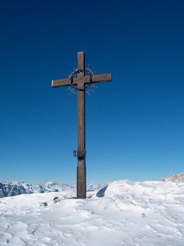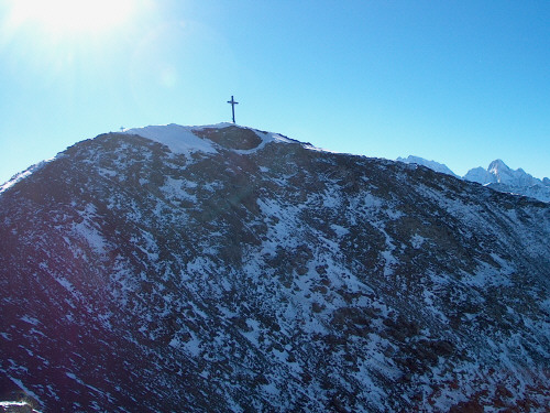 Kapelle und Gipfel, rechts daneben liegt der Sprengtrichter.