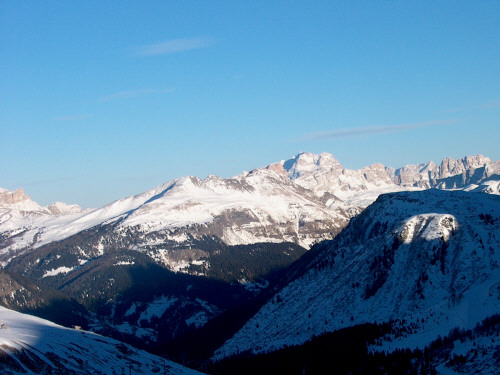 Norden mit der Puezgruppe, im Tal die Dörfer Corvara und St. Kassian,