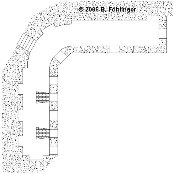 Maßstabgenau ist sie natürlich nicht, ich habe ja auch nichts vermessen, und vieles musste ich anhand meiner und Deiner Fotos rekonstruieren ... Ich hoffe, sie spiegelt trotzdem einigermaßen die Realität wieder. Das Untergeschoß ist noch viel problematischer, hier ist meine Zeichnung fehlerhaft und löchrig. Was mir in der Erinnerung aufgefallen ist: Die Caponniere hat ja eine V-Form; wenn ich es recht bedenke, muss die Poterne quasi von "oben" in die Öffnung des V's hineinkommen ... Das was Du auf einem Deiner Fotos als "Schuttkegel" bezeichnet hast, wäre demnach die Erdüberdeckung des Poternenaufstiegs in die Caponniere. Live sehen konnte ich das ja von außen leider nicht - der Nebel ... Mal sehen, vielleicht krieg ich ja eine Zeichnung hin, die verdeutlicht, was ich meine, aber das dauert.