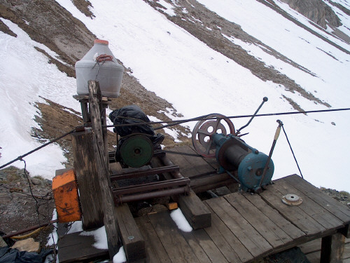 abenteuerliche Seilbahn der alten Hütte, man beachte den Benzintank