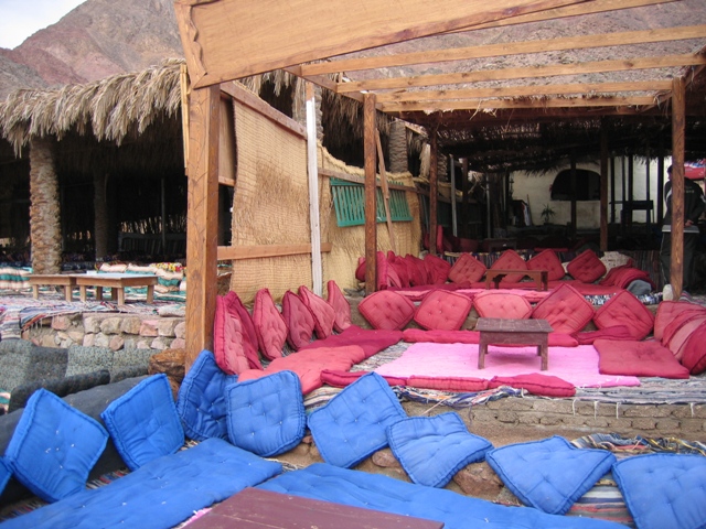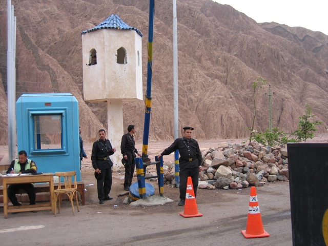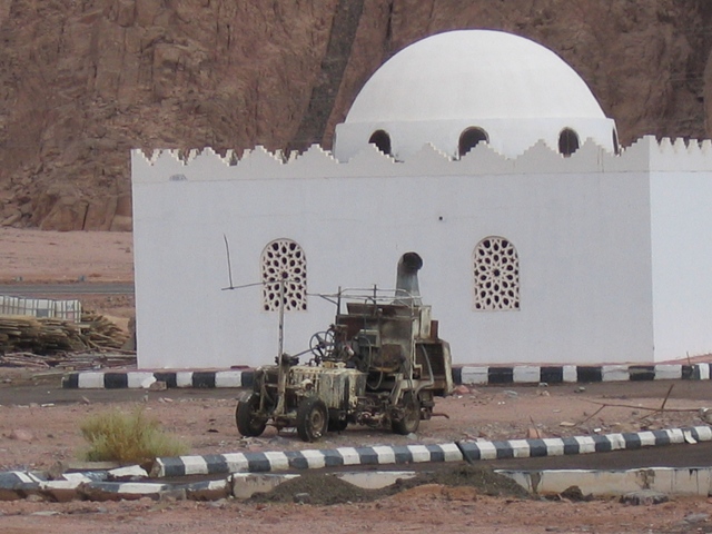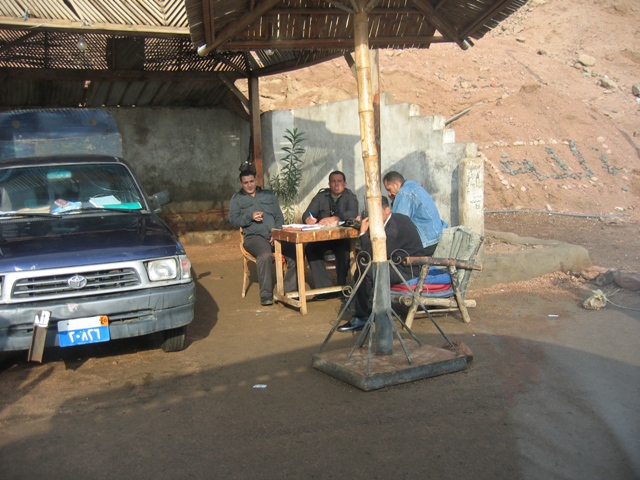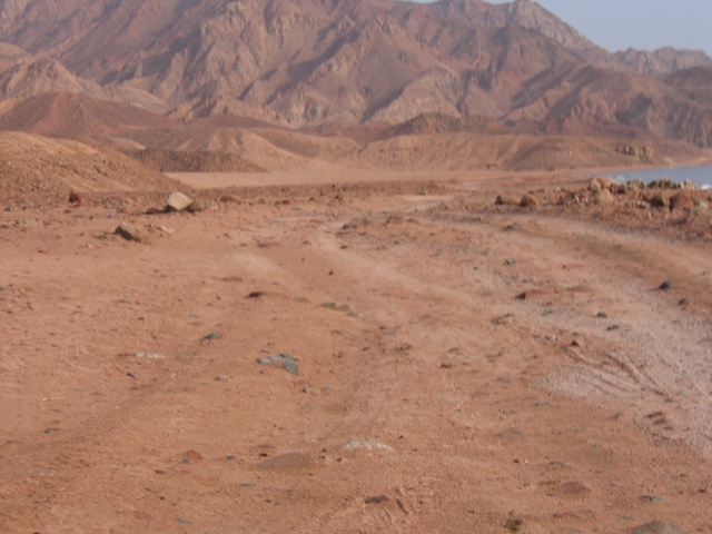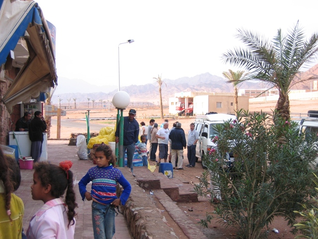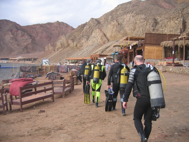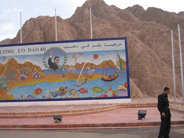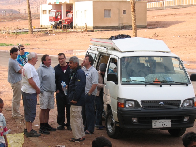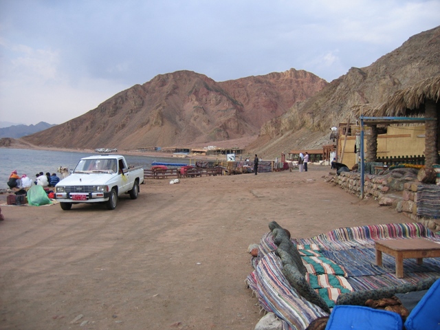 Diese Bilder sind von Plätzen, die nicht so einfach zu betauchen sind, da sie für die breite Masse zu tief liegen, zu abseits sind, übersehen werden oder einfach unbekannt sind. Unser einheimischer Guide verzichtet auf die Nennung seines Namens und auch auf ein Foto von ihm. Er stimmte den Tauchgängen zu, nachdem er unsere Logbücher und Qualifikationen genauestens geprüft und einen ausführlichen Test-Dive mit uns durchgeführt hatte. Wir waren sehr froh, mit ihm einen kompetenten Führer durch die Fauna und Flora unter Wasser gefunden zu haben, der uns auf fast allen Tauchgängen in unserem Urlaub begleitete. 2003 war ich schon mit Theo und 2004 mit Werner in Dahab. Von dort haben wir gute Fotos mitgebracht. Jetzt wollten mein Sohn Uli-Flo und Alex unbedingt die Stellen betauchen. Bei unserer Basis hatten wir schon den Dahabtrip gebucht und fuhren mit einem angemieteten Mini-Bus frühmorgens nach Dahab. Unser Gerödel war schon mit einem Pickup unterwegs. Da die Straße neu ausgebaut wurde, war die Fahrt sehr angenehm.