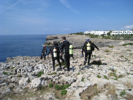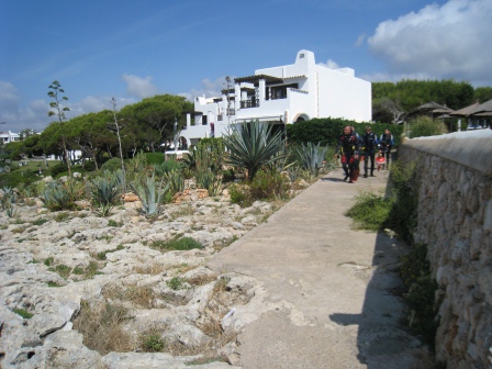 Tauchplatz Parkje Mar: Unsere Ausrüstung wurde in den Tauchbus verstaut und ab ging es durch die Ortschaft Cala d` Or zum Parkplatz am Ende der Carrer del Mar, wo man sich unter schattigen Bäumen umziehen kann. Dann geht es einen gepflasterten Weg zur Küste.