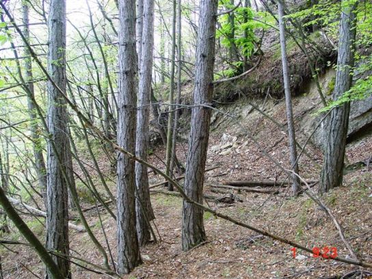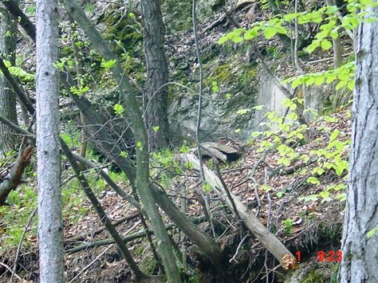 Ich verlasse die Batterie. Wer genau hinschaut, sieht oberhalb des Barackenfundamentes den Eingang zur Batterie- die Betonmauer ist sichtbar. Aber man muss schon verdammt geschulte Augen haben, um diesen Eingang zu finden. Aber wozu ist man schließlich Feldforscher. Die Festung Trient besteht aus vielen solchen Stellungen! Eine Nahaufnahme macht den Eingang sichtbar. 8-fach gezoomt!