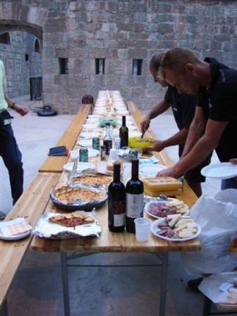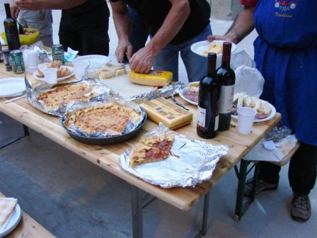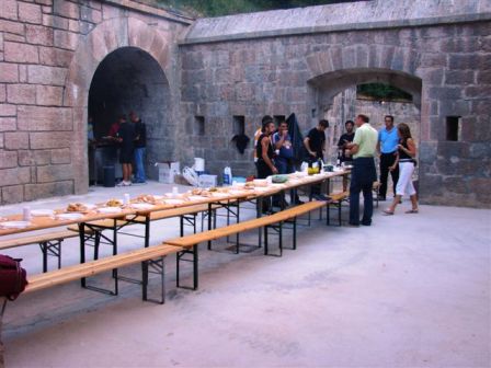 Nach der Einweihung gab es natürlich auch das Fest. Typische Trentiner Küche: Bohnen, Polenta, Bratwurst, Kotelets, Rippchen, Salami, Käse und die Salztorten (von Fr.Dr. Favero gemacht, hervorragend!). Danach Törtchen und Eis. Viel Wein (vor allem selbstgemachter roter Teroldego!) und Bier , eine guter Grappa aus eigener Produktion und ein guter Kaffee rundete alles ab. Danach öffnete man den Prosecco (auch dieser aus eigener Produktion eines Arbeiters aus dem Veneto) und es gab den offiziellen "Brindisi" für die restaurierte Straßensperre Bus di Vela. Viel Lob für Fr. Dr. Michela Favero der obersten Museumsbehörde von allen Seiten. Jeder Arbeiter bekam von mir eine CD : Forte Bus di Vela 1860-2008, eine so gut es ging komplette Dokumentation als Erinnerung und als kleinen Dank für seinen persönlichen Einsatz. Das Fest endete mit ausführlichen Beleuchtungsproben für die Straßensperre. Auf der alten und der neuen Staatsstraße hielten die Autos an! Das alte Werk ist weithin sichtbar und viele fuhren auf den naheliegenden Parkplatz und bewunderten erstaunt die alte Straßensperre, die wieder würdig und trotzig zugleich sagt: Hier bin ich wieder in strahlenden Glanz und Gloria seit 1862, unvergessen, und beherrsche bis heute den Zugang zur Stadt Trient. Der Parkplatz war nach kurzer Zeit voll, die Autos hupten und blinkten mit den Scheinwerfern ( das Werk ist noch offiziell Baustelle und kann noch nicht öffentlich betreten werden) als Dank und Kompliment. Die Straßensperre Buco di Vela, als Projekt 1862 unter dem Namen Bocca di Vela bei der Klause San Vigilio geboren wird am 28, 29 und 30. August für kurze Zeit der Öffentlichkeit vorgestellt. Es gibt dann auch viele Veranstaltungen in diesen drei Tagen. Danach beginnen die Arbeiten zur Inneneinrichtung. Im Jahre 2009 öffnet es offiziell als Museum und Dokumentationszentrum zur österreichisch-ungarischen Geschichte der Provinz Trient. Gruss, VJ