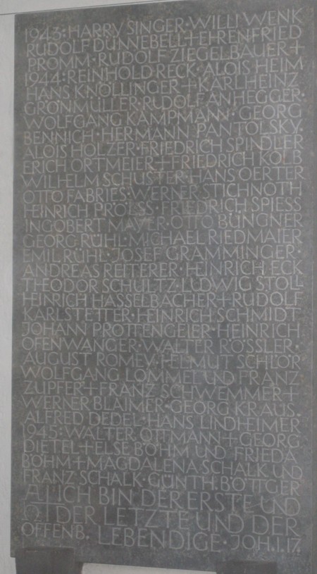 DIE GEMEINDE ST: MATTHÄUS GEDENKT DER GEFALLENEN ICH BIN DER ERSTE UND DER LETZTE UND DER LEBENDIGE Offenb. Johannes 1.17 Leider nur ein Foto von außen durch die schmutzige Scheibe.