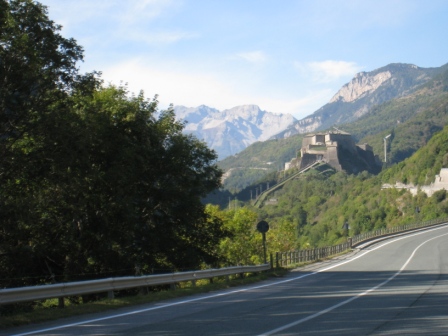 Auf der Landstraße erscheint die Festung auf einem Hügel im Susatal