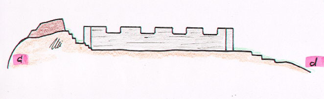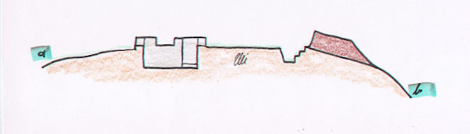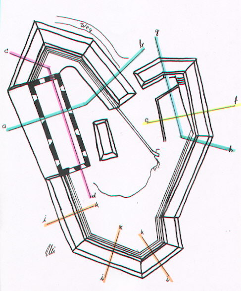 ![]() In der befestigten Stellung befand sich links oben ein Gebäudekomplex aus starken Mauern mit Geschützscharten. Die Stellung hatte kein Dach. Die Wälle bestanden aus gestampftem Erdreich und Schotter. Sie liegt auf alle Fälle über Civezzano auf einer Kuppe.
