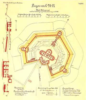 die rot unterlegten Gebäudeteile sind noch vorhanden.