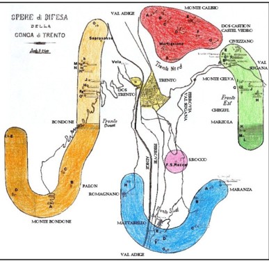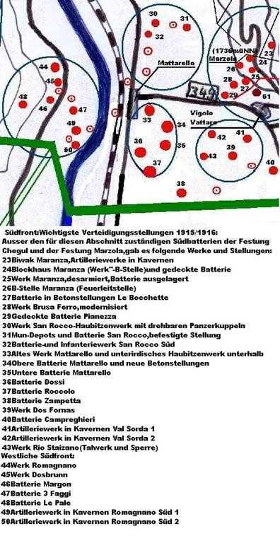 Cornetto und des Palon. Entlang der Militärstrasse ,die über den Rücken des gesamten Bondone-Massivs verläuft gibt es eine Unzahl von Kavernenanlagen, die aber größtenteils zu logistischen Zwecken dienten. Die eigentlichen Verteidigungsanlagen bestanden aus Stützpunkten, meist betonierte Stellungen mit Bunkern, die maximal von einem in Bereitschaft stehenden Infanterie-Halbzug besetzt wurden. Es gab entlang des Bergrückens 8 Hauptstützpunkte der Gruppe Vason und der Gruppe Vanese (Bezeichnungen der militärischen Abschnitte, die Stützpunkte selbst wurden mit V/1 bis V/8 bezeichnet), ergänzt durch weitere kleinere Stellungen, so das ungefähr 30-40 kleinere infanteristische Befestigungsanlagen zusammenkommen. Die italienische Aufklärung weiß darüber anscheinend nichts, in der Karte werden sie nicht mal mit einem allgemeinen Hinweis vermerkt, lediglich A, B und C, also Gipfel Palon und zeitweilige Batterie bei Palu und der Gipfel des Monte Bondone selbst werden erwähnt. Die K.u.K.-Militärführung befürchtete keine große Bedrohung aus dem Westen. Die Sperrwerke am Nordrand des Lago die Garda, im Bereich Riva del Garda, Torbole, Monte Brione und Nago schützen den Eingang zum Valle dei Laghi, und blockierten jede italienische Offensivtätigkeit bis zum Ende des Krieges. Das oben genannte Tal endet bei dem Sperrwerk Buco di Vela (oder Bus di Vela auf Dialekt) .Dieses kontrolliert und blockiert die in diesem Tale verlaufende Staatsstrasse von Riva-Arco kommend in Richtung Trient. Doch dazu etwas später. Auch hielten die Sperrwerke auf dem Tonale-Pass bis zum Kriegsende den Gegner in Schach, somit war auch dieser Zugang zum Festungsplatz Trient durch das Val di Non gesperrt und gesichert. Das auf der Karte großzügig gemalte U im unteren Bereich der Westfront, ausgehend von Palon ,dann Monte Bondone ,aufsteigend zu der Pos. D der zeitweiligen Batterie auf dem Monte Rofta und endend bei der Pos. E der Batterie auf dem Doss Negro ist reichlich gewagt. Der Hauptverteidigungsabschnitt-West endet in seinem südlichen Bereich bei Monte Palon und Monte Cornetto, diese hatten jedoch die Hauptaufgabe die Südfront mit ihrer Feuerkraft zu unterstützen. Bei D und E und ihrem