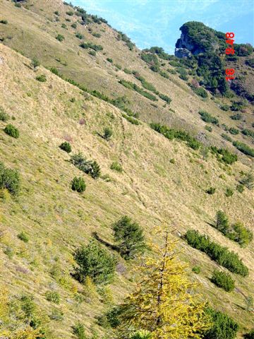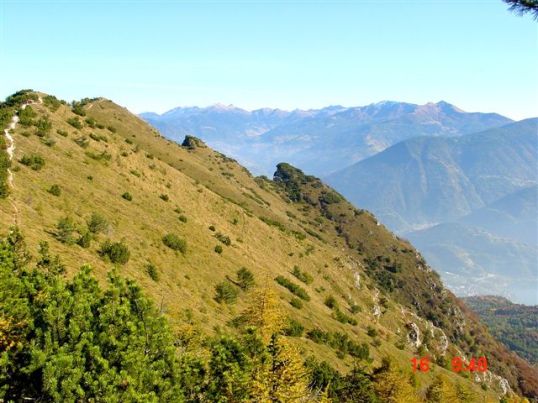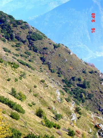 Vom Südgipfel aus zu sehen: Die Flanke des Marzola-Sattels und Blick auf den Nordgipfel. Unterhalb der ansteigenden Flanke ist der fast völlig verschüttete Schützengraben zu erkennen. Ich dachte zuerst, es wäre ein Pfad, aber es handelt sich um den Kampfgraben! VJ