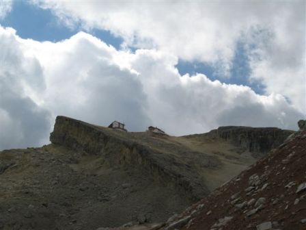 Rückblick auf Forcella Lagazuoi, die Lagazuoi Hütte, die Bergstation der Seilbahn und die österreichische Verteidigungsstellung oberhalb der Felswand