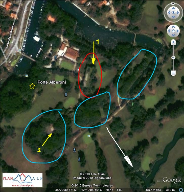 Blaue Kreise sind die Batteriestellungen mit den Abgängen zu den