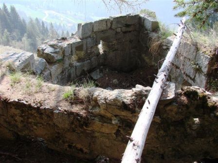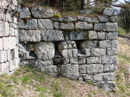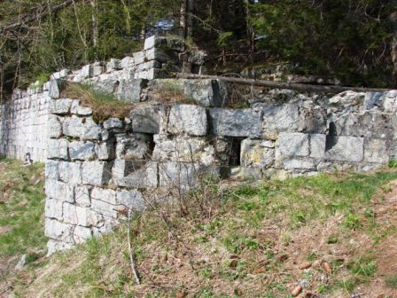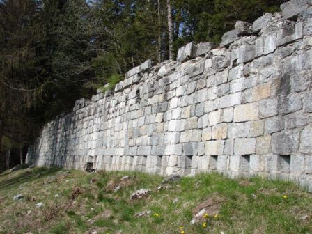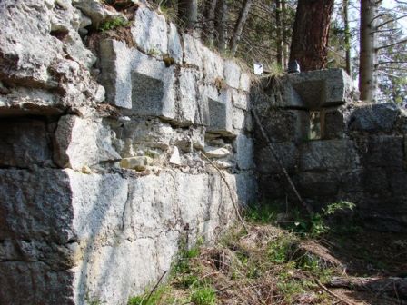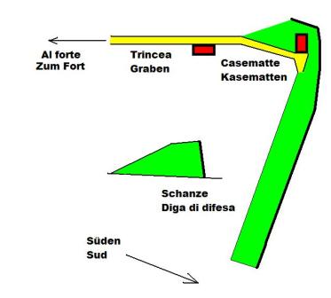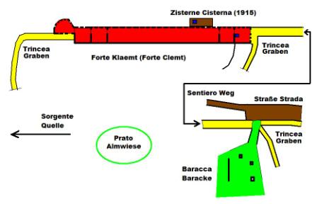 eingegossen. Die gesamte Originalanlage ist in behauenen Granitblöcken gebaut (Baustoff ist Standard vor Ort bis heute). Diese alte Anlage wurde anscheinend in eine zweite Verteidigungslinie integriert, die im WK I das Val Rendena zwischen Pinzolo und Madonna di Campiglio sperrte.Die hölzernen Zwischendecken zwischen dem EG und 1.Geschoss wurden entfernt, auch die Oberzüge aller Türdurchgänge wurden durch armierten Stahlbeton ersetzt. Es wurde eine zweite äussere 2-Kammer Zisterne in Beton hinzugebaut. Aussenbereich: Vor der gedeckten Kaserne befindet sich in Richtung Süd eine Schanze mit ca. 250m Länge sehr alter und obsoleter Bauart zu der von den lateralen Ausgängen die Reste zweier mit Granitblöcken ausgekleideter Gräben führen. Auf der Almwiese zwischen Schanze und Kaserne standen vermutlich Geschütze oder konnten zumindest dort in Stellung gebracht werden. Auf der Wiese gibt es auch Reste von Holz-Baracken mit Natursteinfundament. Wasserversorgung durch 2 Quellen in der Nähe der Kaserne. Von Norden her führt ein alter Armierungsweg (gedeckt gegen Feindeinsicht) zur Kaserne.Der Originalname ist nicht sicher, die Befestigung nennt sich heute Forte Claemt, oder auch Forte Clemt, laut Auskunft Nicola Fontana könnte es sich um die sehr alte Verteidigungslinie Lago Molveno-Madonna di Campiglio handeln (Sperrung des Val Rendena). Der Originalname der Befestigung könnte nur im Archiv in Wien auffindbar sein wie auch evt. andere Dokumente zu dieser Sperre. Sie liegt auf halben Wege zwischen Pinzolo und Madonna di Campiglio oberhalb der Ortschaft San Antonio di Mavignola und hatte eine beherrschende Position. Innerhalb des Kasernenbaues gibt es noch eine alte kleine Zisterne und eine Latrine, ein Zwischenteil scheint Offiziersunterkunft mit Ofen und eine Küche gewesen zu sein. Gruss, VJ