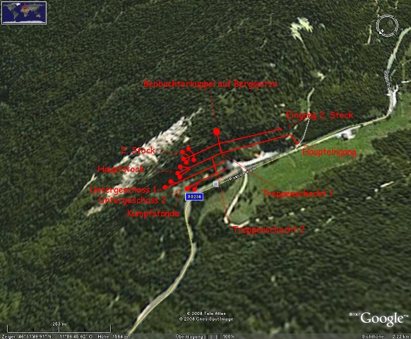 Aufbau der Anlage: Üblicherweise wurden die Sperrgruppen aus einzelnen Bunkern gebildet um eine starke Zergliederung der Gruppe zu ermöglichen, Anhand der Erfahrungen aus den Festungskämpfen des 1 Weltkrieges wußte man das kleinere Anlangen schwer zu Treffen sind. Aufgrund der Enge des Passes und der Möglichkeit die Anlage komplett im Fels zu bauen wurde hier eine zusammenhängende Großfestung angelegt. Die Anlage hat drei Stockwerke wobei das mittlere auf Höhe des Passes liegt, das untere dürfte gut 30 bis 40 m tiefer liegen. Da die Treppe nach unten nicht fertig gebaut wurde ist ein Zugang nicht möglich. Beim Bau wurde von den Kampfständen ausgehend das untere Stockwerk ausgebrochen sodann wurde die Treppe von unten aus nach oben gebaut. Nach Fertigstellung der Treppe wären erst die Kampfstände gebaut worden. Bei Baueinstellung wurden diese Zugänge von außen zugemauert. Das Untergeschoß hatte Kampfstände für MG und PAK (= Panzer Abwehr Kanone), und Kasematten für die Mannschaft. Im mittleren Stockwerk waren die 75mm Batterie und Nahkampfstände untergebracht. Die Geschütze konnten von hier aus den ganzen Meraner Talkessel unter Feuer nehmen. Die MG und Panzerabwehrkanonen hatten die Aufgabe angreifende Panzer und Infanterieverbände zu bekämpfen. Im mittleren Stockwerk war Raum für die Unterkunft und Versorgung der Mannschaft. Ein Treppenturm mit parallelen Aufzugschacht führt nach oben zum 3 Stock und weiter bis zum Gipfel des Felsmassiv auf dem ein Beobachtungsturm gebaut werden sollte. Das 3te Stockwerk dürfte noch gut 50 bis 60 mt Felsüberdeckung haben. Auch dieses Stockwerk verfügt über einen Zugang, der auf den Berg oberhalb des Passes liegt. Der Stollen ist auch hier so groß das mit LKW eingefahren werden konnte. Auch dieser Stock ist nur teilweise fertig gestellt, es wurde an allen Stockwerken zugleich gebaut. Im Obergeschoss war eine zweite 75mm Batterie vorgesehen, sowie MG und PAK. Als MG war das neue Luftgekühlte MG37 von Fiat vorgesehen, meist kamen im Alpenwall aber die Beute MG´s von Schwarzlose aus dem WK1 zum Einsatz . Gebaut wurde die Anlage von Baufirmen aus Süditalien, das gesamte Baugelände war Sperrgebiet und wurde vom Militär bewacht. Der einzige Südtiroler der die Anlage betreten durfte war der Pfarrer vom St. Felix, der gelegentlich zu letzten Ölung von verunglückten Arbeitern gerufen wurde. Die Arbeit in solchen Anlagen war schwer und gefährlich, jedoch konnten man gut verdienen sodass Arbeiter genug zur Verfügung standen. Die Anlage wurde im März 1940 geplant und sofort angefangen. Im Juli 1941 wurde aufgrund von Materialknappheit und der Verbindung von Berlin und Rom (deutsche Kriegshilfe für Italien) der Bau eingestellt. Die Festung war für ca. 150 Mann Werksbesatzung ausgelegt. Die Bewaffnung sollte 12 MG´s, 4 75mm Kanonen, 2 PAk und 2 Scheinwerfer betragen. Anhand der Anzahl am Geschützpforten dürften aber 6 Haubitzen geplant gewesen sein. Zusätzlich sollte die Unterbringung von Mannschaften und Waffen für Gegenangriffe möglich sein. Die Anlage sollte ein Gesamtvolumen von 25.500 Kubikmeter haben, die Kosten ohne Innenausstattung waren mit 7,000.000 Lire vorgesehen. Die Anlage befindet sich heute in dem Zustand wie sie vor über 60 Jahren versiegelt wurde, durch den bereitliegenden Schotter in den Rohstollen und noch verschalte Betonwände hat man das Gefühl als ob die Arbeiter erst vor kurzem abgezogen wären. Die Mauern der Zugänge waren sehr dünn, was dazu führte das sie eingerissen wurden um die Anlage zu besichtigen. In den 80er Jahren stiegen 2 Deutsche in die Anlage ein und stürzen durch den Treppenschacht in den Tod, daraufhin wurde die Anlage gründlich vermauert. Später wurde am Haupteingang ein Massives Stahltor eingebaut durch dieses man die Anlage heute betreten kann. Aufgrund der Ungesicherten Schächte ist die Anlage verschlossen. Die Anlage gehört inzwischen dem Land Südtirol. Die Landesverwaltung will die Anlage der Gemeinde St. Felix übertragen, Verhandlungen laufen bereits. WP Halbfertiger
