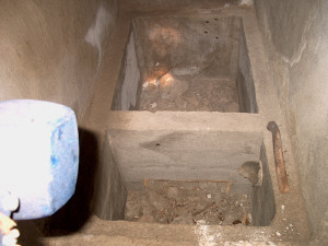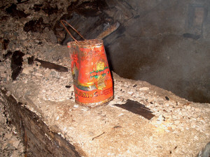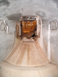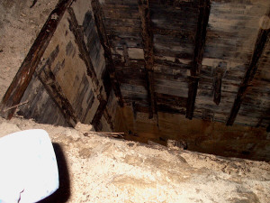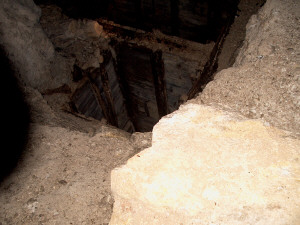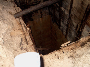 Der kleine Schacht, die Holzverschalung ist nicht mehr entfernt worden. Der Hauptschacht, in diesem