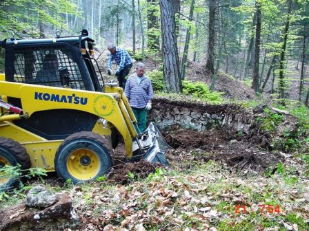 Il piccolo "Komatsu" comincia a sudare come anche i volontari. I primi reperti sono trovati (si trovano di piu!), l´acqua della pasta e gia sul fuoco, pausa con caffe´ e grappa... Alla fine rinasce anche la vecchia strada militare, grazie al´intervento della piccola ruspa.. Freilegungsarbeiten bei einer Geschützstellung 12cm/M80 der Maranza-Batterie, es sind insgesamt 4 Stellungen, 2 für Kanonen und 2 für Mörser. Der kleine Komatsu kommt ins Schwitzen, wie auch die Freiwilligen. Das Wasser für die Pasta ist schon auf dem Feuer, kleine Pause mit Kaffee und Grappa. Am Ende setzt der Komatsu der Forstverwaltung auch den Armierungsweg instand.... VJ