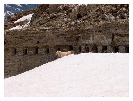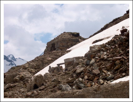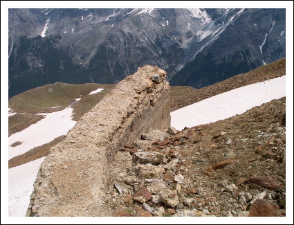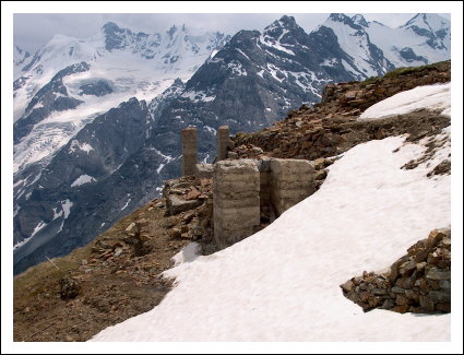 Die Stellung Goldsee und das Lembruchlager Die Kannonenstellung Goldsee wurde 1912 als vorgeschobener Posten des Werks Gomagoi errichtet. Die Anlage befindet sich rechts vom 2700mt hohen Stilfser Joch. Das Stilfser Joch ist im Sommer mit dem Auto zu erreichen. ( Achtung es sind 48 Spitzkehren zu bewältigen) Ab der Passhöhe geht´s zu Fuß rechts hoch zur Dreisprachenhütte danach leicht abwärts zum Goldsee. (Gut ausgeschildert) Im Frühjahr 1915 verteidigte hier der Gendarmeriemeister Andreas Steiner die Passhöhe und Eroberte den 3000mt hohen Scorluzzo. In die Stellung Goldsee wurden die Kanonen vom Werk Gomagoi und Nauders in Stellung gebracht, die dann gegen die von Italien besetzte Trafoier Eiswand eingesetzt wurden. Versorgt wurde die Stellung über eine Seilbahn die vom Hotel Franzenhöhe heraufführte und später bis zum nahen Lehmbruchlager erweitert wurde. Die Strasse konnte kaum bis zur Passhöhe benutzt werden da die Italiener auf der nahen Trafoier Eiswand Gebirgsgeschütze installiert hatten. Das Lembruchlager befindet sich zwischen der Dreisprachenhütte und dem Goldsee, man kann noch jede Mengen von Hütten- und Mauerresten finden. Das Lager war für die Italienische Artillerie nicht zu erreichen da die Geschosse neutrales Schweizer Gebiet überfliegen hätten müssen. So entstand hier eins der größten Lager im Ortlergebiet mit Lazzarett, Kino und Badeanstalt! Versorgt wurde das Lager über die Seilbahn vom Goldsee. Im ganzen bestanden drei Seilbahnen: Von Trafoi zum Hotel Franzenhöhe, von hier zum Goldsee und dann zum Lembruchlager.