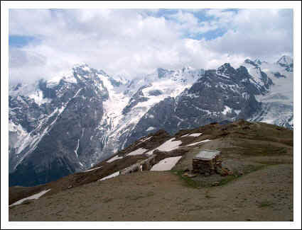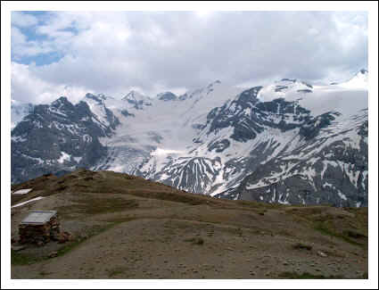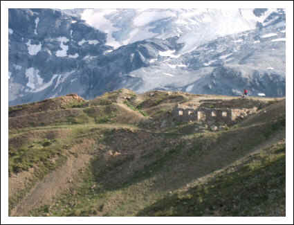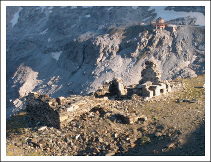 Lagerhütten im Hintergrund die Tibethütte am Stilfserjoch